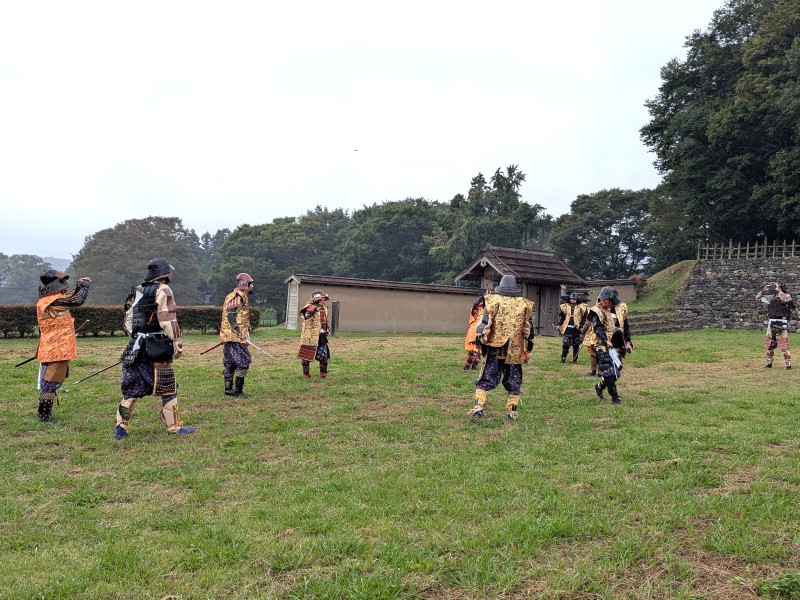 続いて、復元された四脚門や石積み土塁が圧巻の『鉢形城公園』へ。 皆様、戦国武将になりきって写真撮影をされたり、団体様ならではの「合戦シーン」を再現してみたりと、思い思いに楽しんでいらっしゃいました。 (※雨が強まってきたため、少し早めに切り上げました)